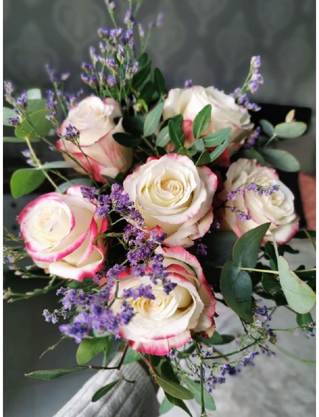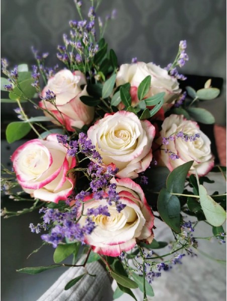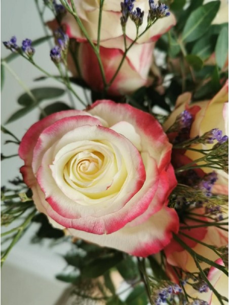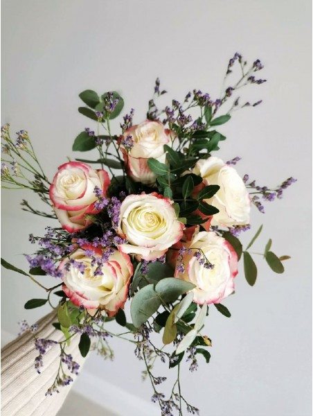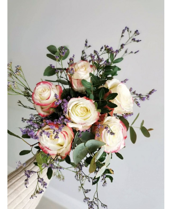 5-6 Rosas Sweetness, Limonium blue, verdes de relleno y Eucaliptus cinerea.
