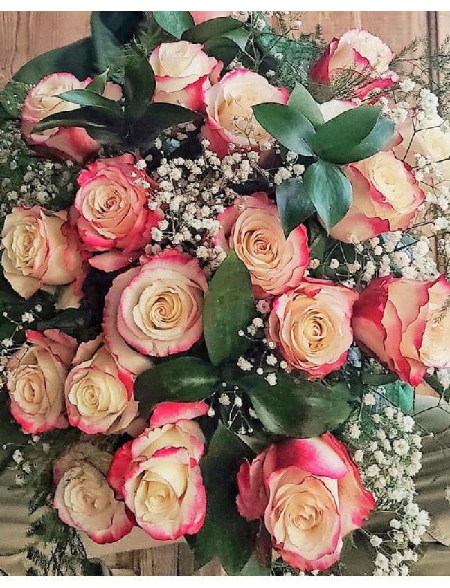 Opción Máxim 23-24 Rosas combinadas, Ruscus y Asparraguera. |